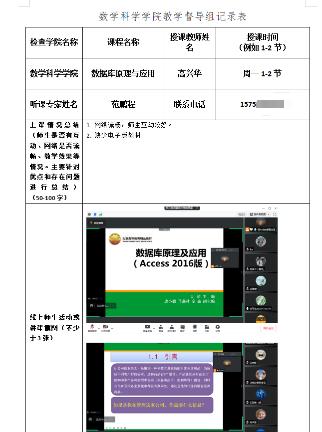 学院领导班子、教学委员会和督导组通过随机进入线上课程观看教师在线授课实况、查阅在线教学资源、了解学生在线学习互动等方式开展教学督导检查,并填写教学督导记录表,及时反馈督导检查情况。
