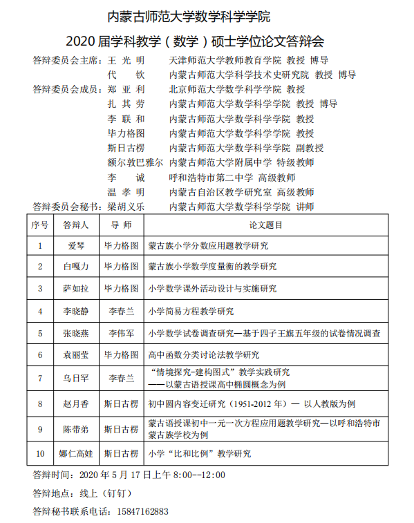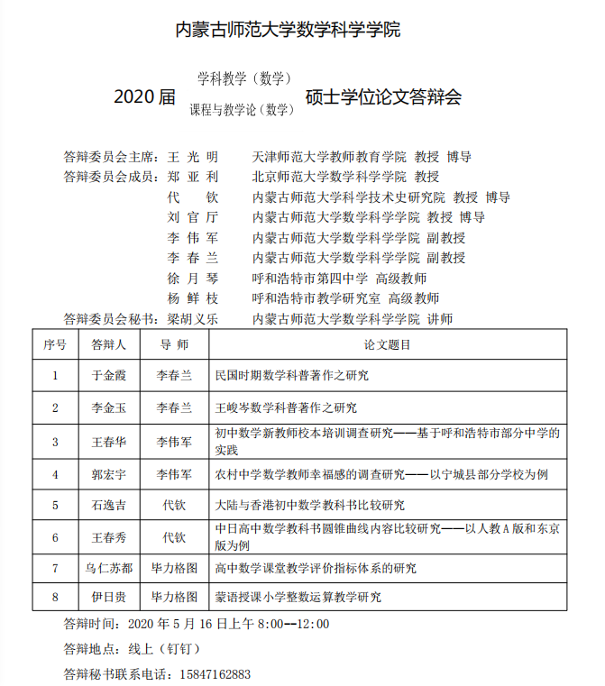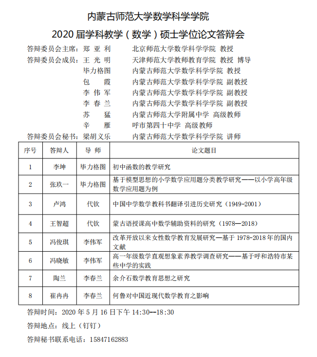 2020届数学教育方向研究生答辩安排