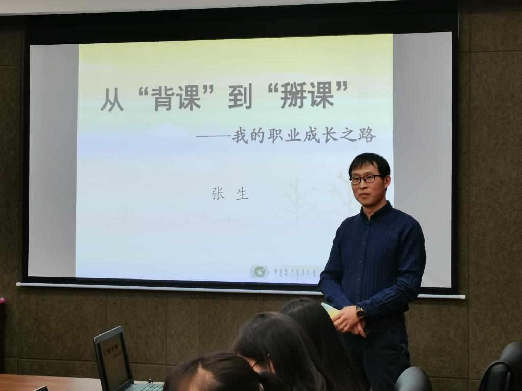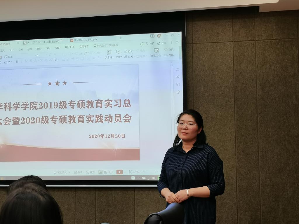 会议由李春兰老师主持,共四个环节:一是2019级的银霞、于晓宇、王占和乌日罕等四位实习生代表对实习工作进行总结报告;二是中学教师分享自己的教学经验与感悟;三是播放实习生制作的教育实习视频,回顾过去70余天的实习工作;四是学院领导包霞副院长对本次教育实践活动进行总结。