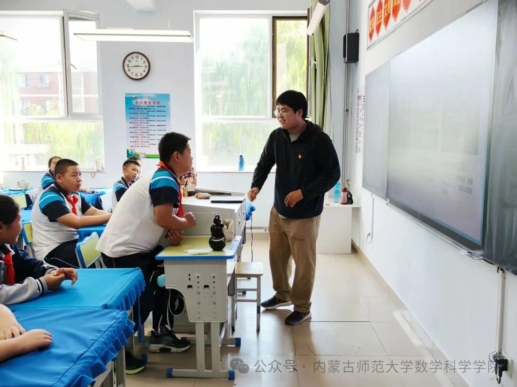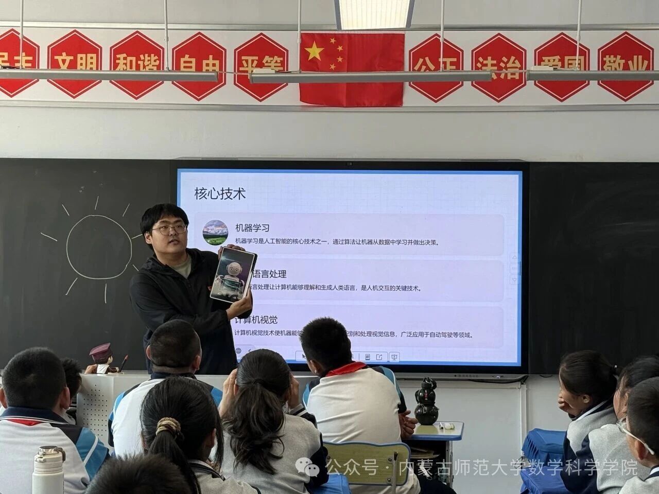 在和林格尔县乳业开发区第一小学,内蒙古科学技术普及学会兼职副秘书长、PP电子游戏网站PP电子游戏网站博士研究生乌日乐等一群研究生科普志愿者,他们用所学的“数据科学与智能信息处理”“基础数学”“应用数学”等学科专业,用通俗易懂的语言,为小学生普及“人工智能是什么”“人工智能会做什么”“机器是怎样看懂图像的”,通过活动让学生积极体验,在活动中感知科技、思考未来、收获新知。