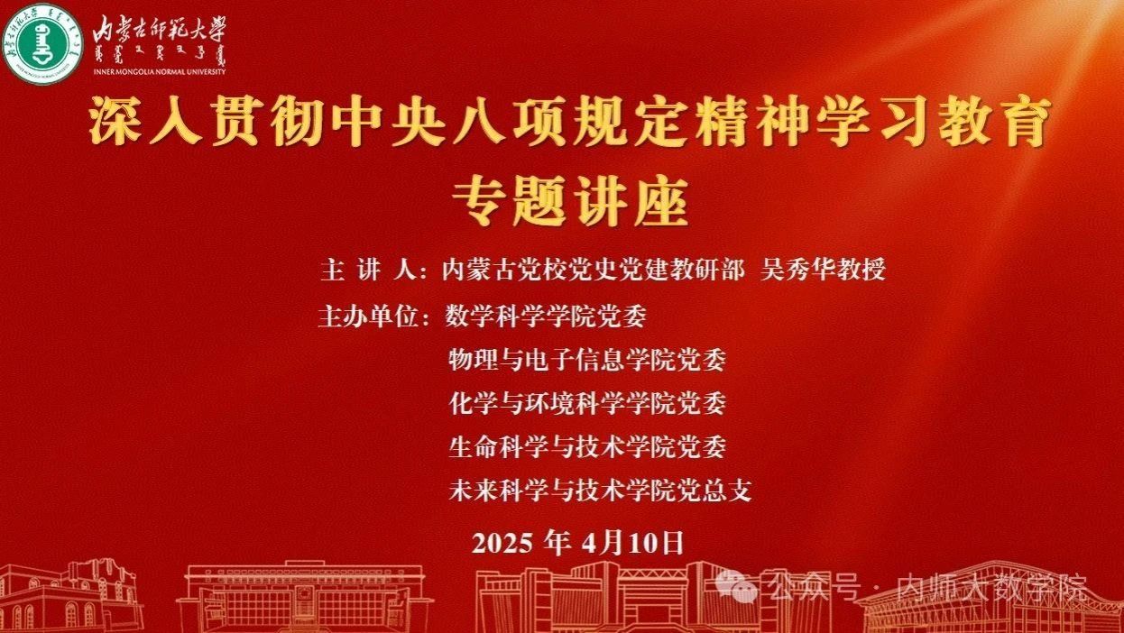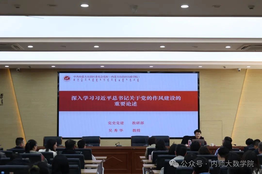 为深入贯彻落实党中央、自治区党委、学校党委深入贯彻中央八项规定精神学习教育精神和要求,高质量开展学习教育活动,4月10日,PP电子游戏官网联合化学与环境科学学院、物理与电子信息学院、生命科学与技术学院和未来科学与技术学院在赛罕校区行政楼三楼报告厅举办深入贯彻中央八项规定精神学习教育读书班专题讲座。讲座邀请内蒙古党校党史党建教研部吴秀华教授作题为“深入学习习近平总书记关于党的作风建设的重要论述”专题讲座。