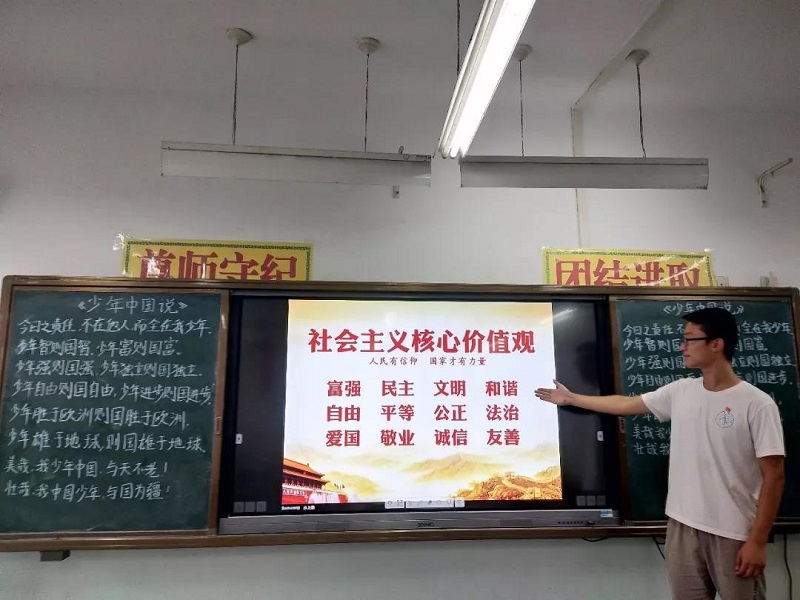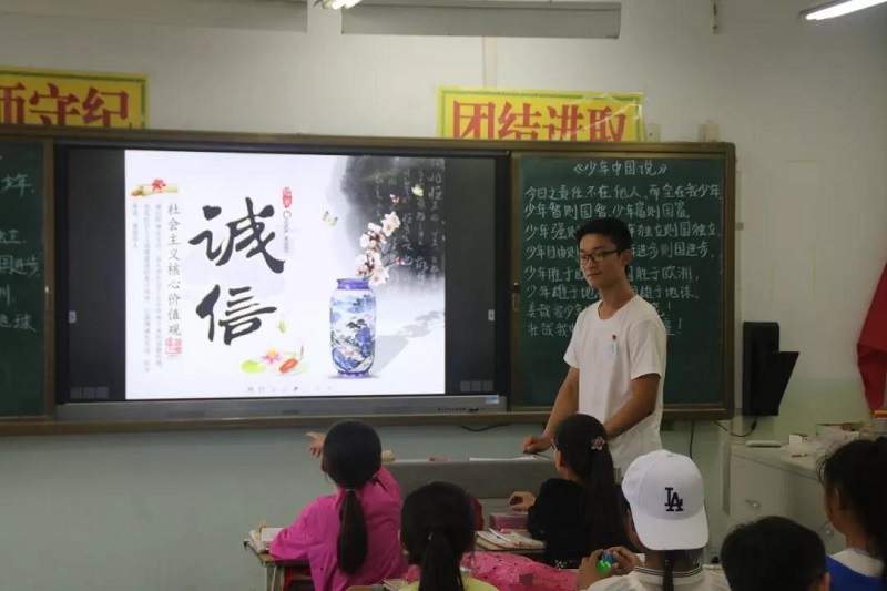 志愿者小老师动情的授课让孩子们理解“诚信”、“敬业”和“爱国”,通过孩子们分享小故事以及生活中简单事例,深入分析,逐渐让孩子们从心里感悟。还通过简单却富有哲理的箴言使小学生内化于心、外化于行。少年强则国强,少年独立则国独立,今天做祖国的好儿童,明天做祖国的建设者,美好的生活属于少年,美丽的中国梦属于少年
