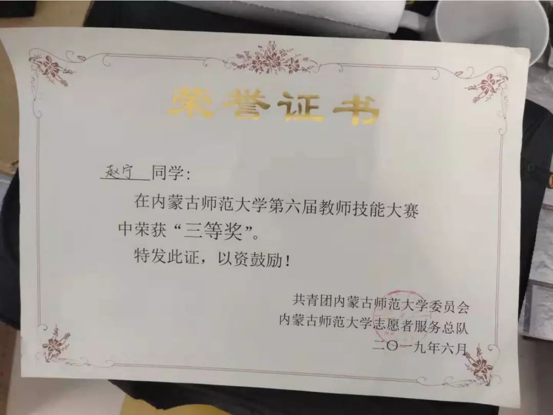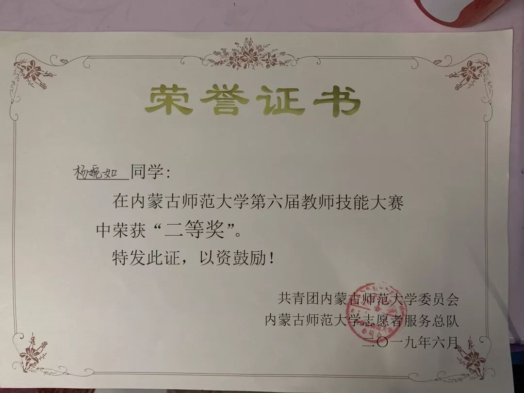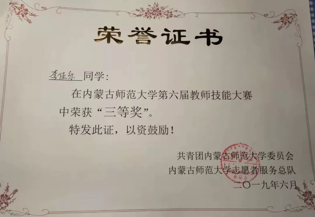 16级数学与应用数学汉班学生,2019年荣获内蒙古自治区第四届师范生教学技能大赛数学与应用数学(汉语)组优秀奖。