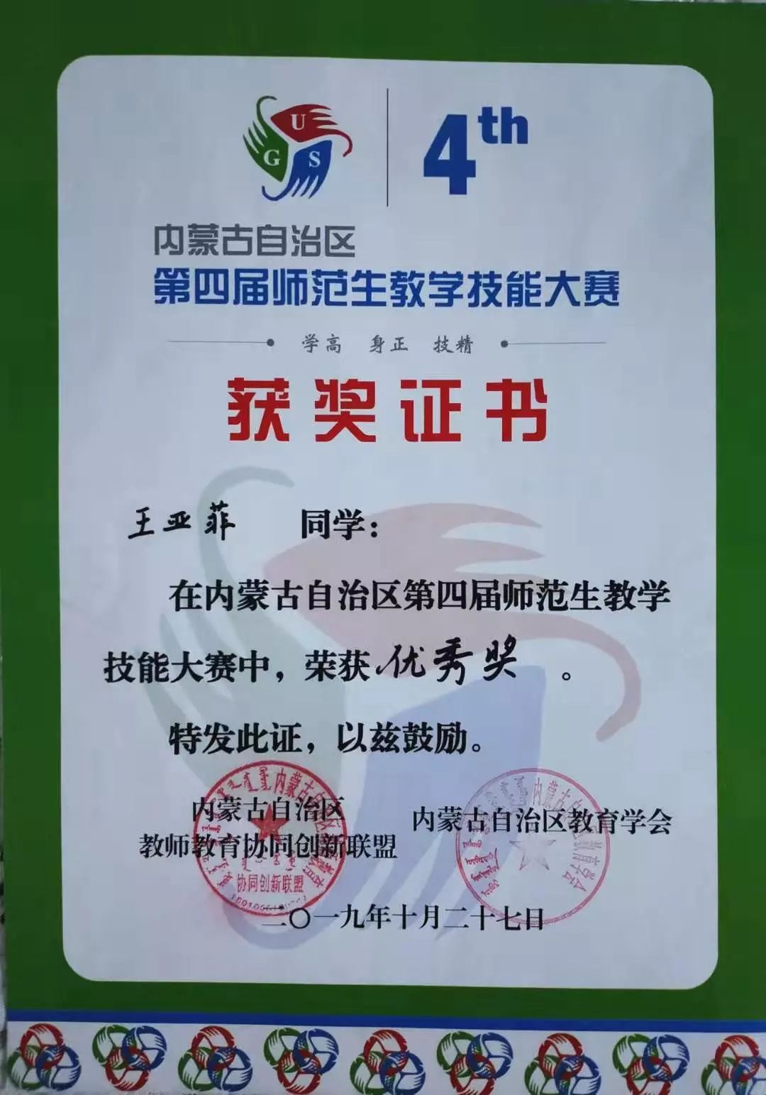 16级数学应用数学蒙班学生,2019年荣获内蒙古自治区第四届师范生教学技能大赛数学与应用数学(蒙古语)组一等奖。
