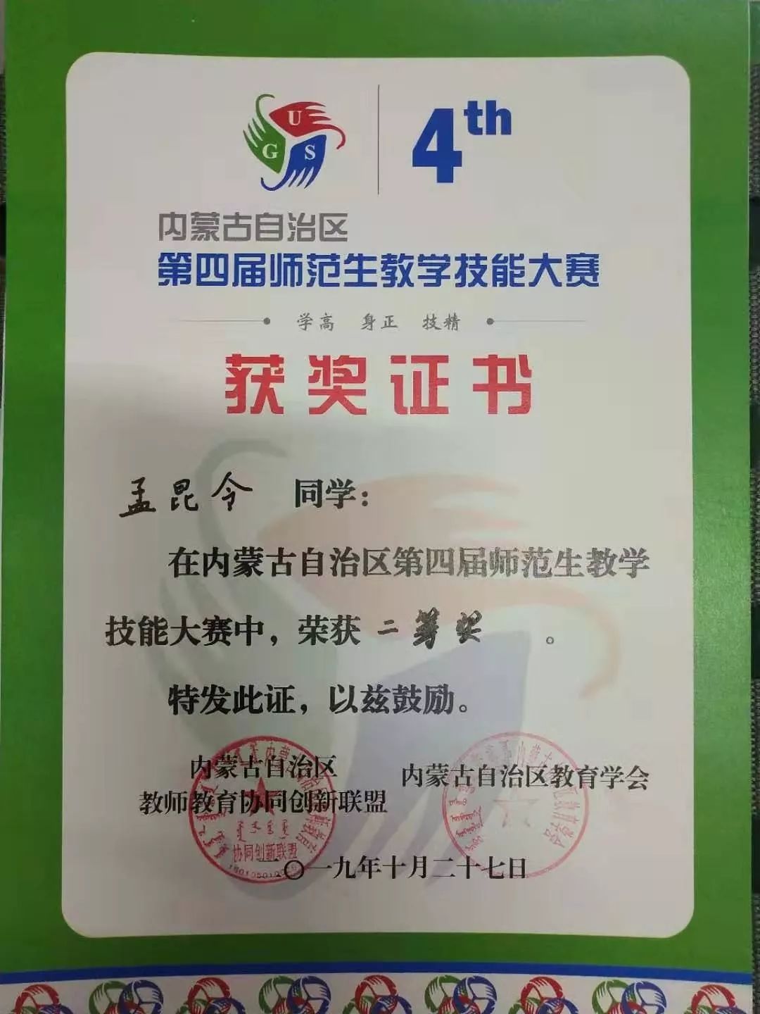 16级数学应用数学蒙班学生,2019年荣获内蒙古自治区第四届师范生教学技能大赛数学与应用数学(蒙古语)组二等奖。