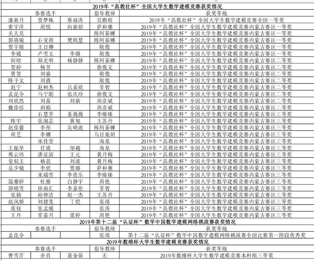 2019年PP电子游戏官网学生积极参与各类数学建模竞赛,并屡获佳绩,其中在2019“高教社杯”全国大学生数学建模竞赛中,由PP电子游戏官网2017级潘新月、贾梦姝、蔡禄涛三位同学组成,范鹏程老师指导的队获得2019年全国大学生数学建模竞赛全国一等奖。这是我校首次获得该项比赛全国一等奖,也是全区高校在本次比赛中获得的唯一一等奖,另有5个队获得内蒙古自治区赛区一等奖,8个队获得赛区二等奖,16个队获得赛区三等奖;在2019第十二届“认证杯”数学中国数学建模网络挑战赛中1队获得全国比赛第一阶段优秀奖;在2019数维杯大学生数学建模竞赛中1队获得本科组三等奖。