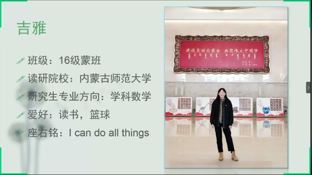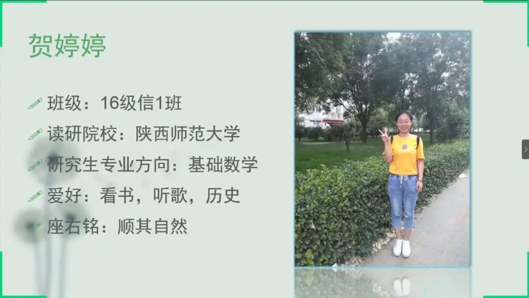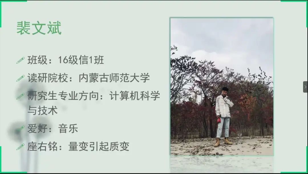 为树立优良学风,同时给有考研意向的同学们提供一个可以获取更多考研信息的机会,2020年7月11日下午,PP电子游戏网站利用腾讯会议平台举办了考研经验交流会,此次交流会邀请到了PP电子游戏官网部分16级考研成功的学子——赵小红、贺婷婷、吉雅、裴文斌、朱慧敏、张萌萌、赵雪梅、尼日嘎拉、韩磊、刘慧、冯晶。本次考研经验交流会由17级信息一班贾宇婧主持,PP电子游戏官网各班同学积极参加了本次交流会。