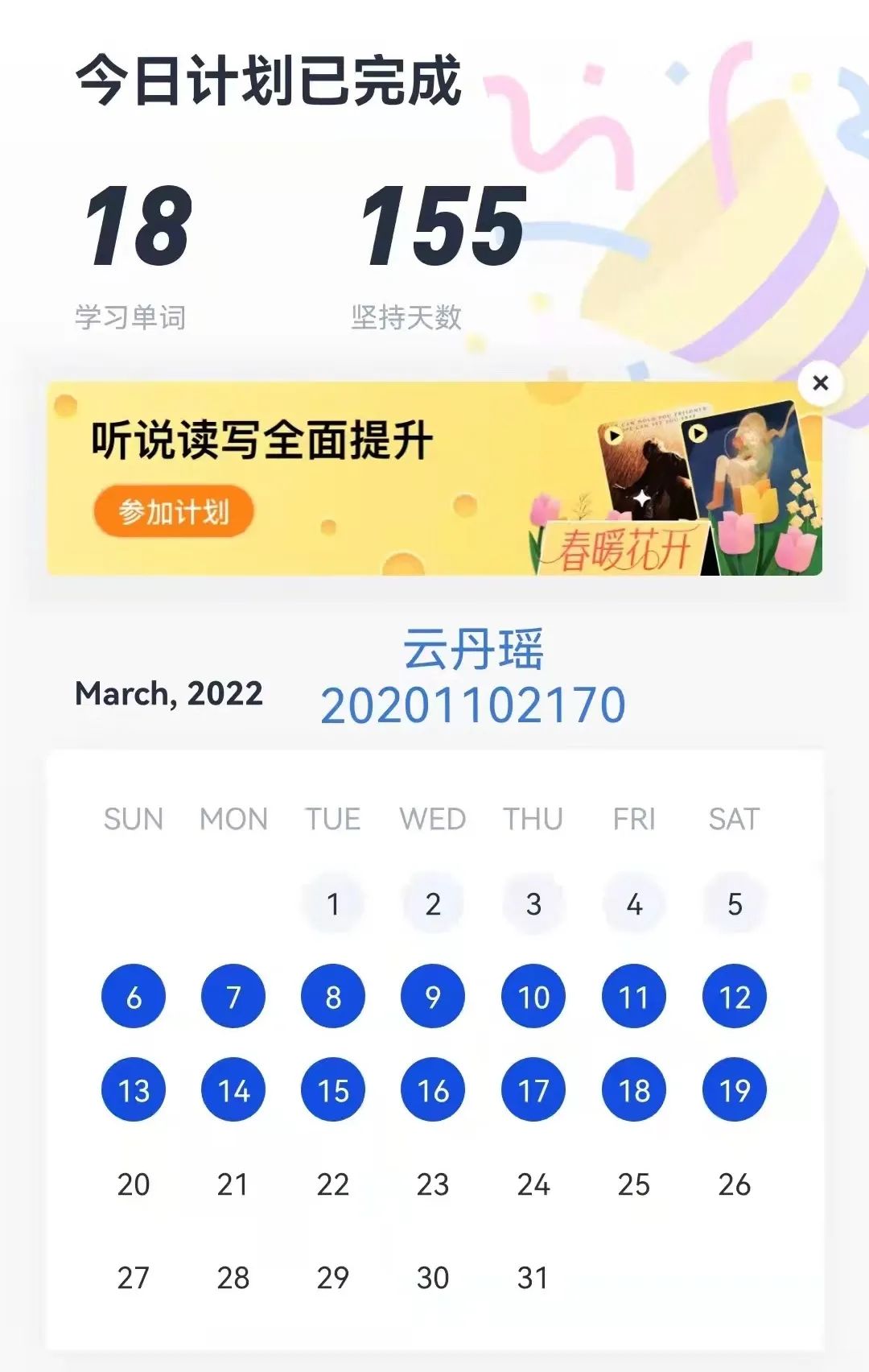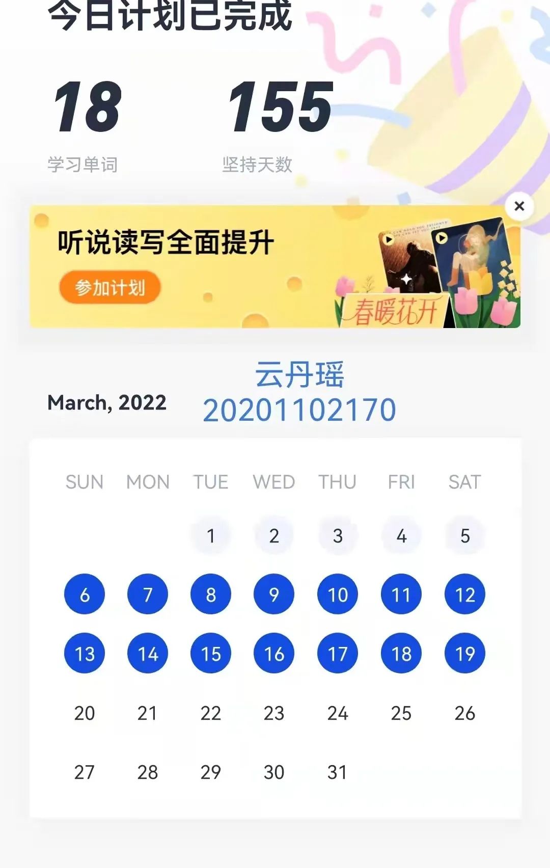 为了丰富学生的居家学习生活,提高学生的学习自觉性,PP电子游戏网站开展了“学习解疫,提升有我”的英语单词打卡活动,150名学生积极响应活动,进行打卡学习。