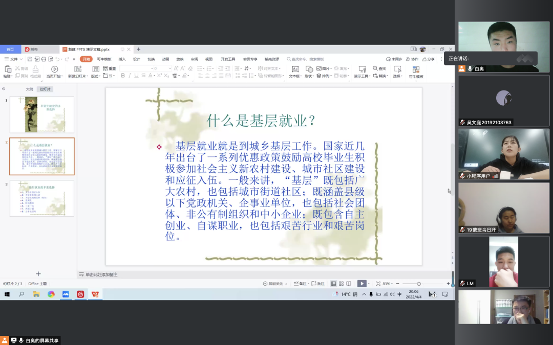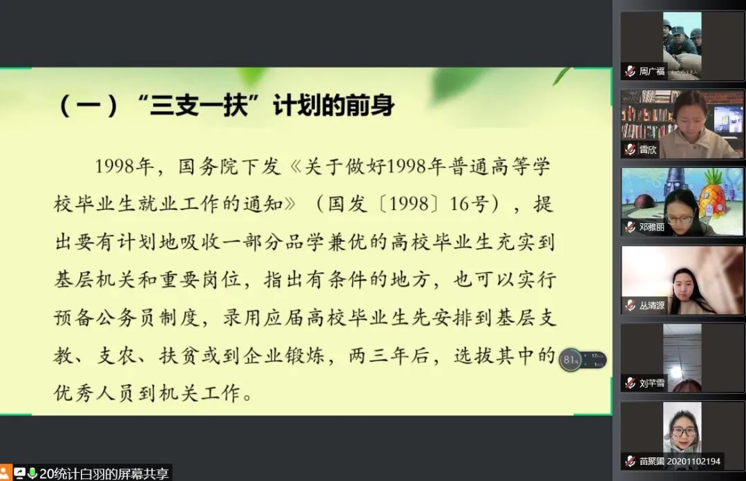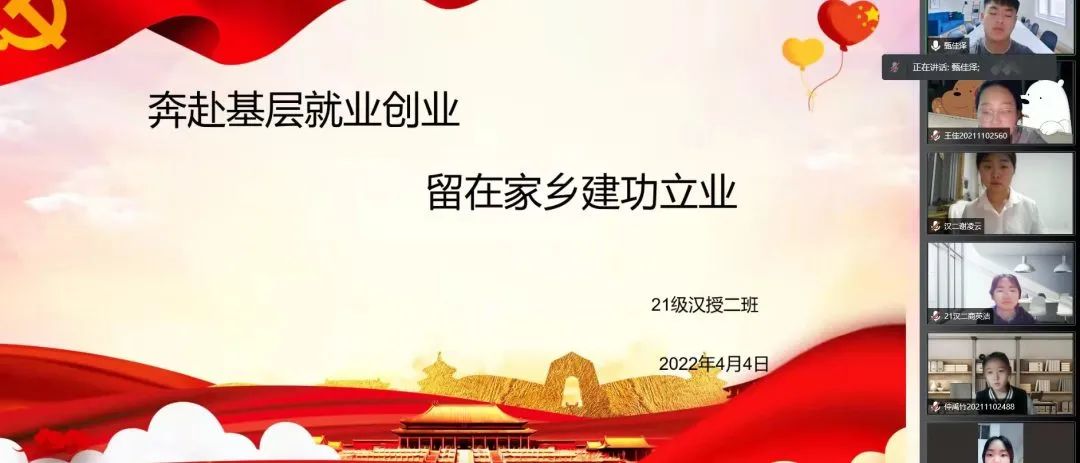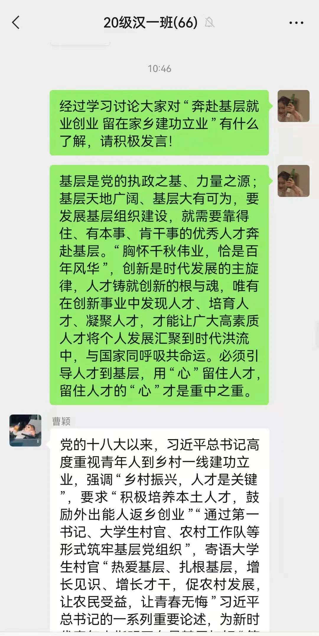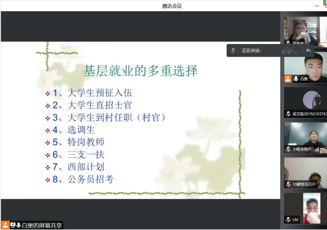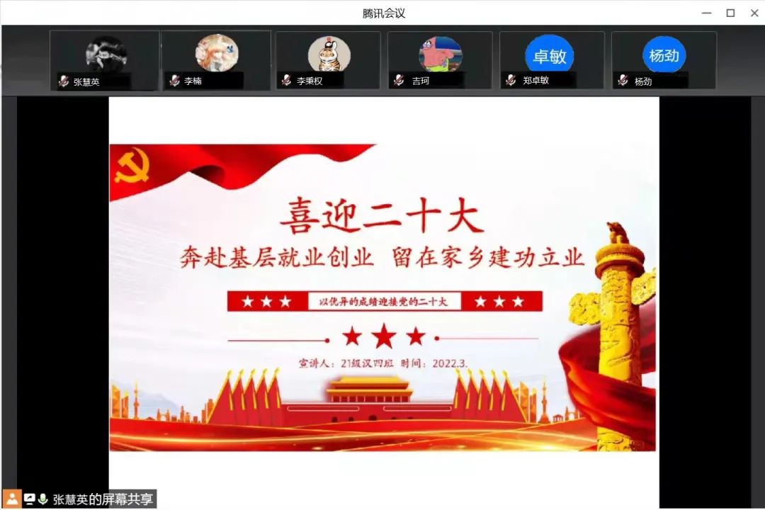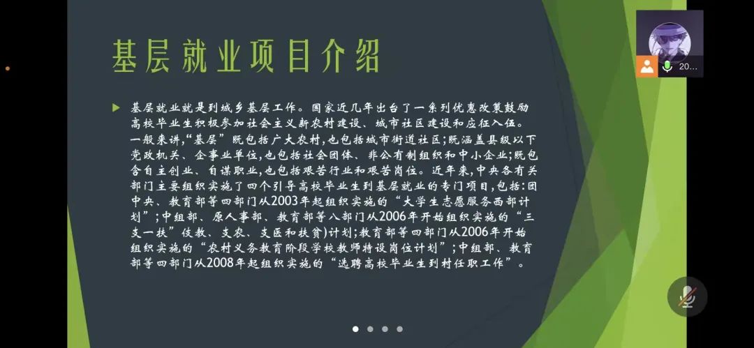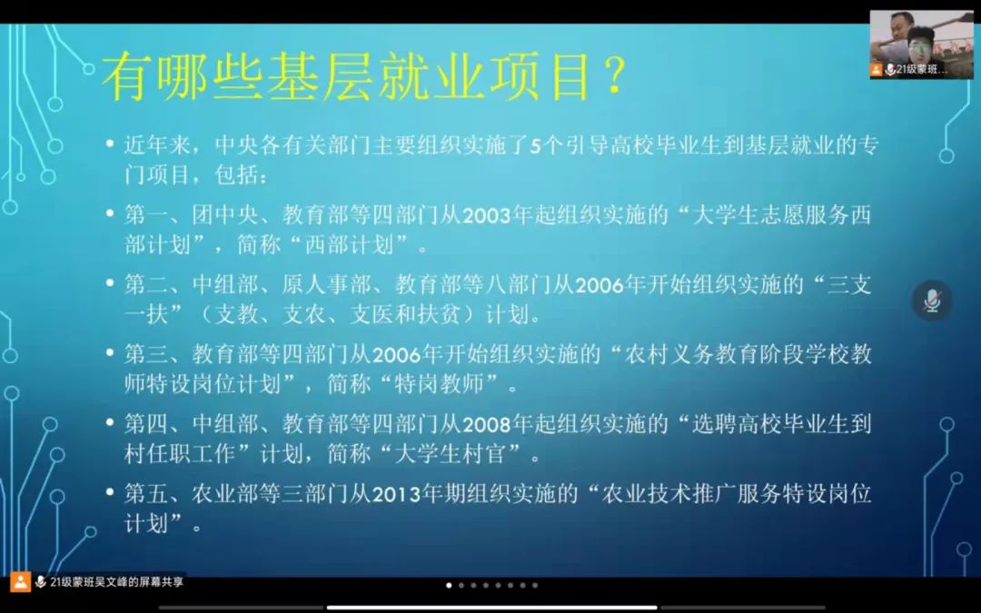 国家近几年出台了一系列优惠政策鼓励高校毕业生积极参加社会主义新农村建设、城市社区建设。为进一步让同学们了解基层就业,PP电子游戏网站各班级开展“奔赴基层就业创业,留在家乡建功立业”线上主题班会,针对基层就业的项目类型,优惠政策等内容进行学习,在充分理解基层就业扶持政策的基础上引导各班同学们加入基层就业。
