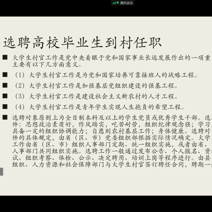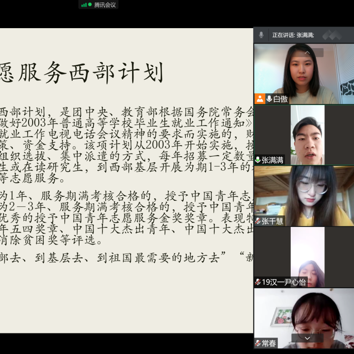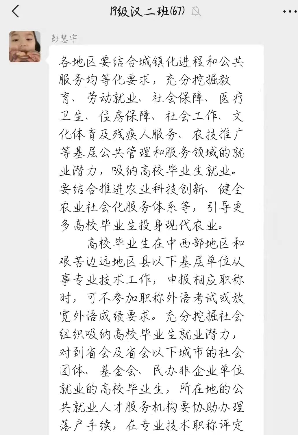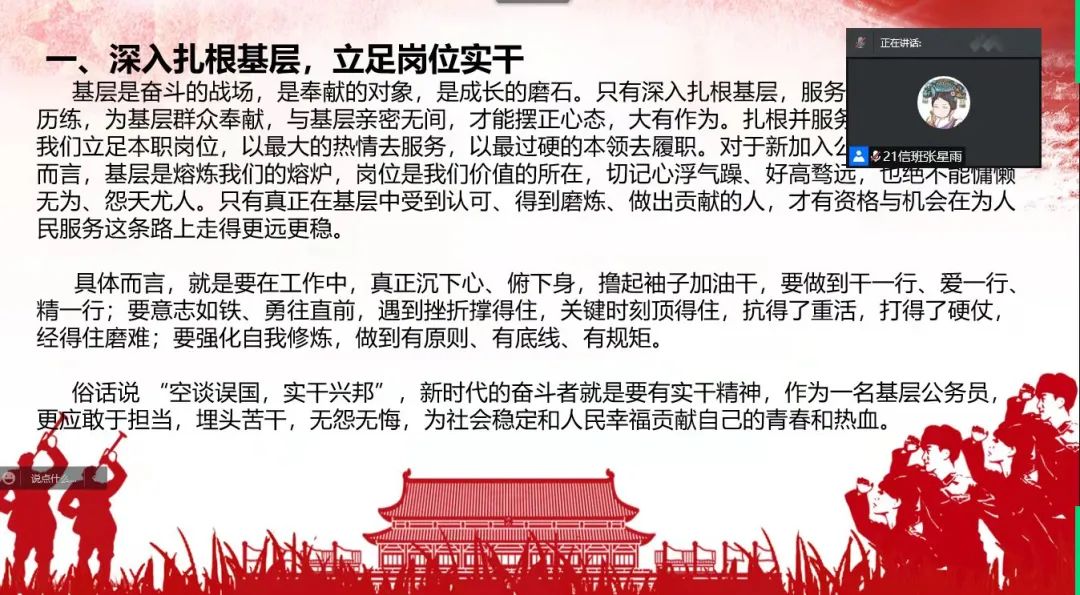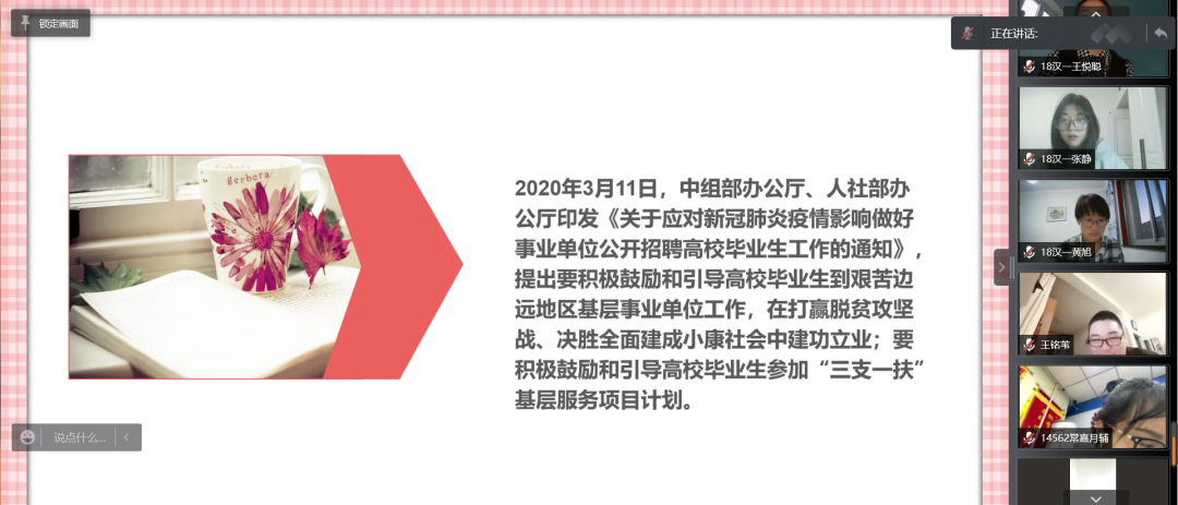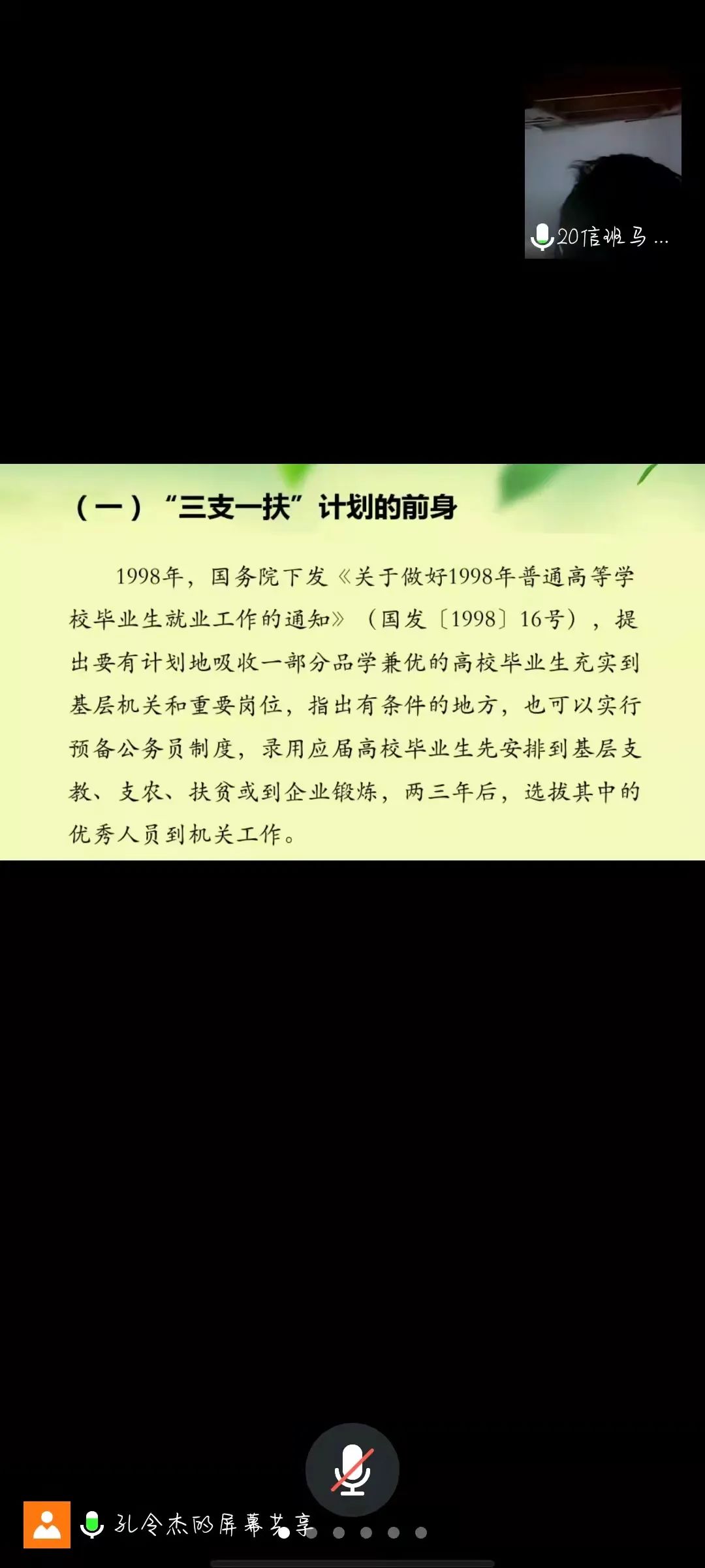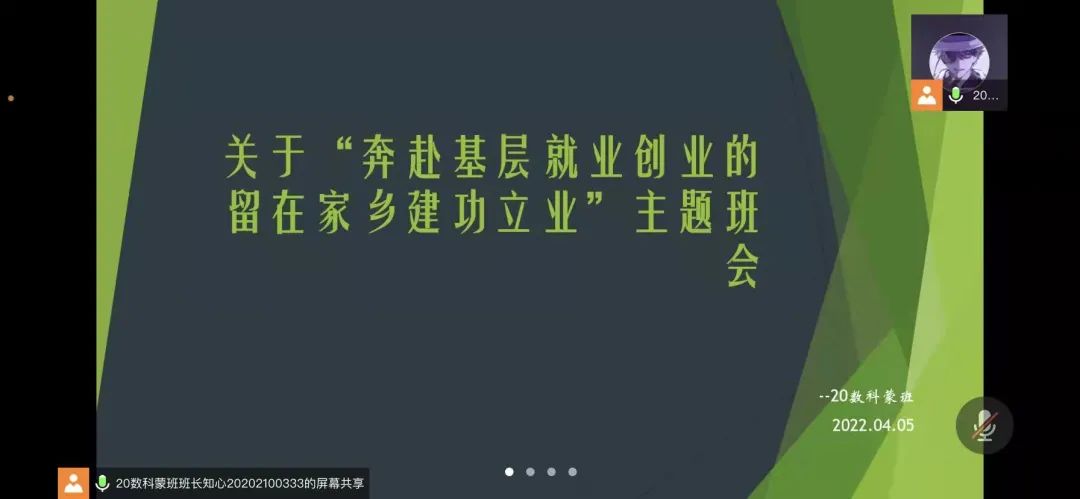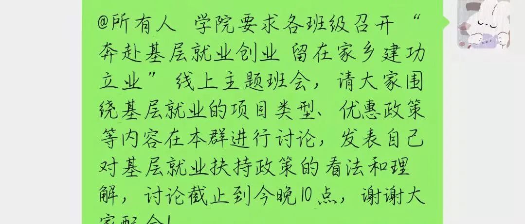 国家近几年出台了一系列优惠政策鼓励高校毕业生积极参加社会主义新农村建设、城市社区建设。为进一步让同学们了解基层就业,PP电子游戏网站各班级开展“奔赴基层就业创业,留在家乡建功立业”线上主题班会,针对基层就业的项目类型,优惠政策等内容进行学习,在充分理解基层就业扶持政策的基础上引导各班同学们加入基层就业。