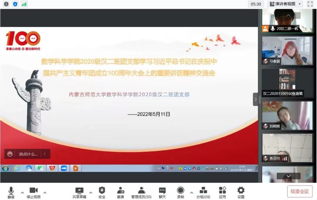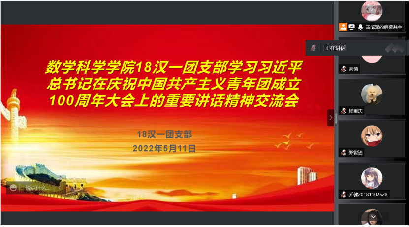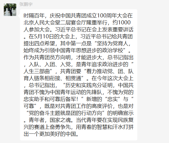 5月10日,庆祝中国共产主义青年团成立 100 周年大会在京隆重举行,习近平总书记发表重要讲话。PP电子游戏网站全体团员青年收看了大会盛况,聆听了总书记的重要讲话。会后,各团支部积极行动,组织开展了学习习近平总书记在庆祝中国共产主义青年团成立100周年大会上的重要讲话精神交流会,分享学习心得,感悟党的关怀,以实际行动为团的百年华诞献礼。