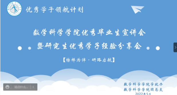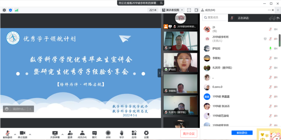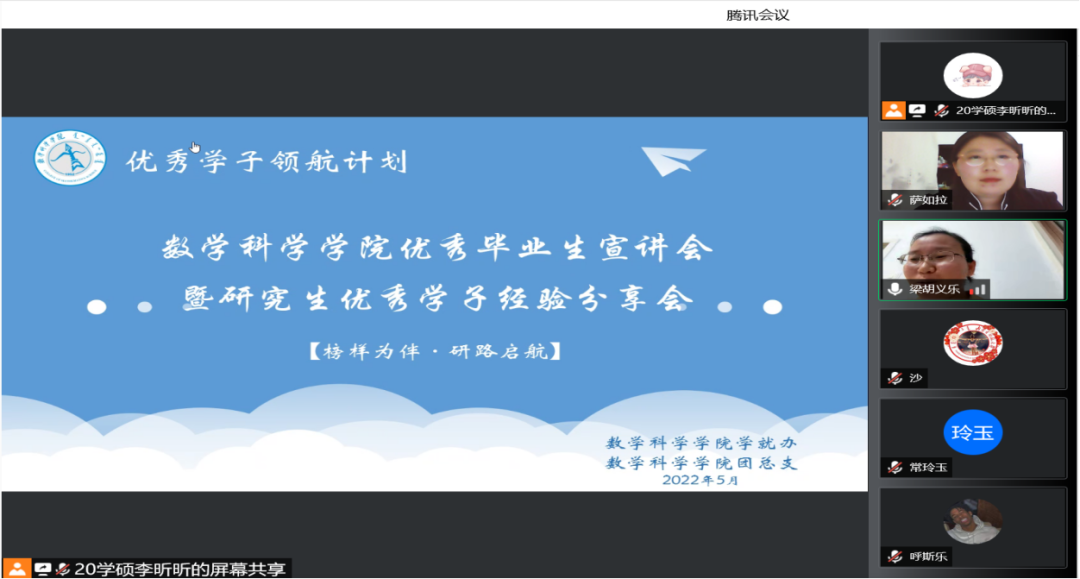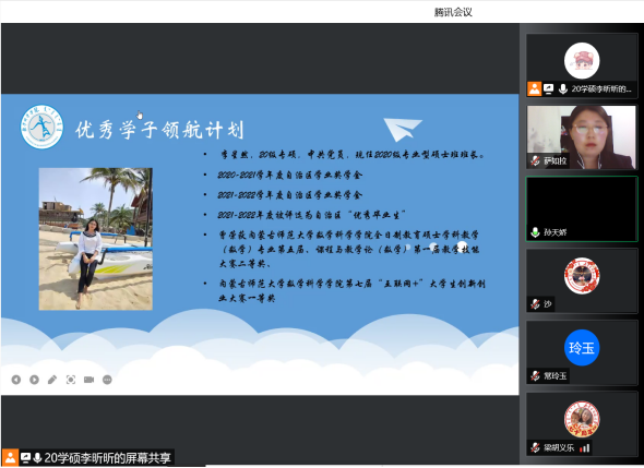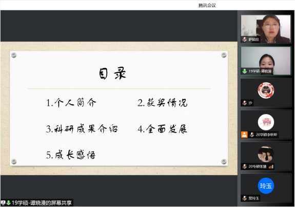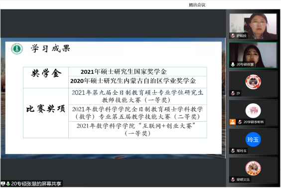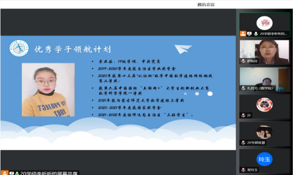 为了充分发挥研究生优秀学子的示范引领作用,更好地落实《PP电子游戏网站关于开展“榜样为伴·研路启航”研究生国家奖学金获得者事迹宣传活动的通知》《内蒙古自治区教育厅关于报送2022年春季学期研究生教育教学典型案例的通知》《关于组织开展PP电子游戏网站“学生劳动教育宣传月”活动的通知》等文件要求,PP电子游戏官网于5月23日晚,组织全体研究生开展“PP电子游戏网站优秀毕业生宣讲会暨研究生优秀学子经验分享会”,邀请PP电子游戏官网2021年度国家奖学金获得者索亚茹、张慧,2021年度自治区奖学金获得者孙天娇、谭晓漫,2021-2022年度自治区“优秀毕业生”李星然、“三好学生”索亚茹,共5名优秀学子为大家分享自己学习生涯中的经验和感悟。