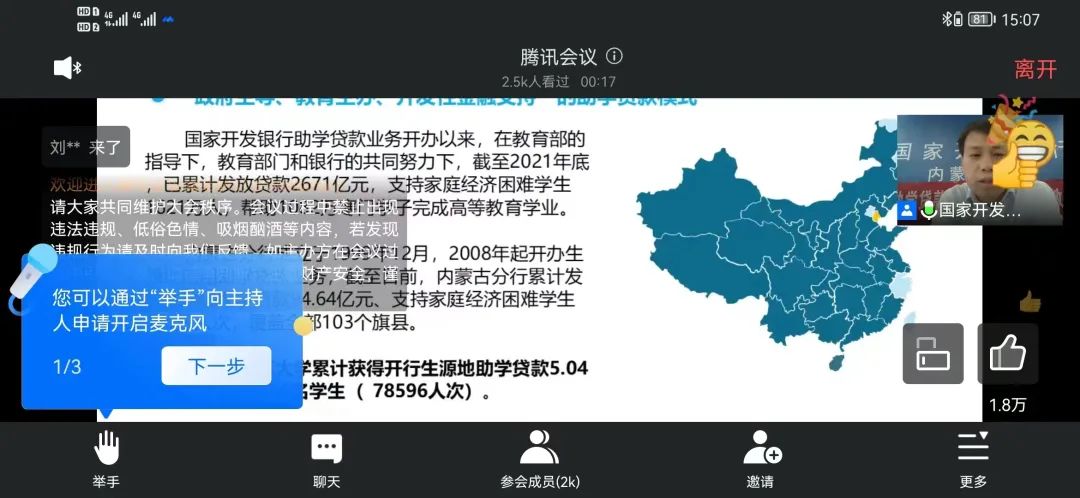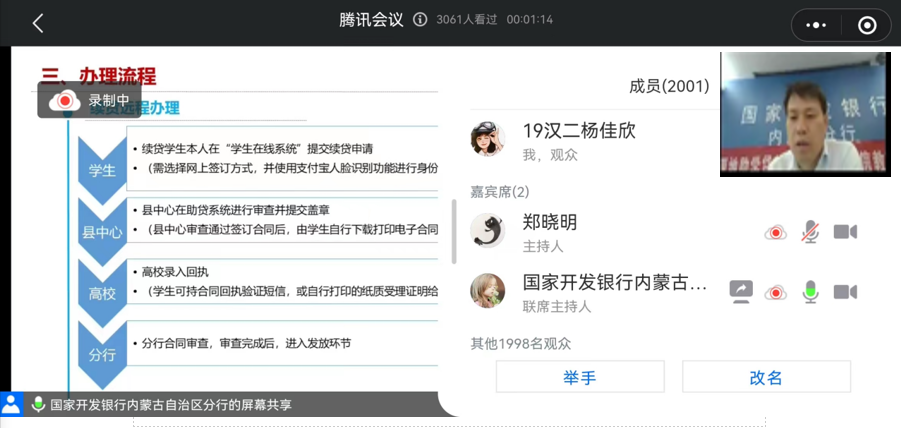 特邀国家开发银行工作人员在线上为我校师生进行以助学贷款业务政策介绍和金融知识普及的专题讲座,引导学生珍爱信用、理性借贷,提高学生征信意识、金融意识、风险意识、法律意识,增强责任感,帮助学生树立正确的消费观、价值观、荣辱观。