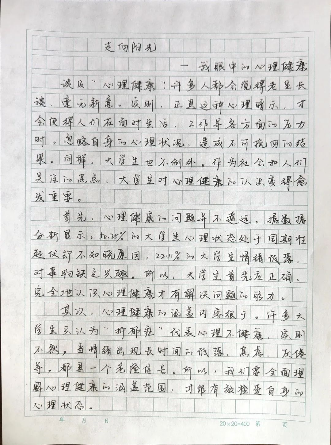 为提升心理育人质量,增强大学生心理调适能力,PP电子游戏官网开展了“我爱我”心理健康征文活动。此次征文活动共86人参加,同学们从个人成长经历分享(自己的心理变化以及相关的收获或感悟)、我眼中的心理健康(谈及大学生对心理健康的认识)、我与心理健康(自己参与过的心理健康活动相关的经历)等方面,通过用笔端的表达方式,抒发了自己对心理健康的见解,以下是部分文章: