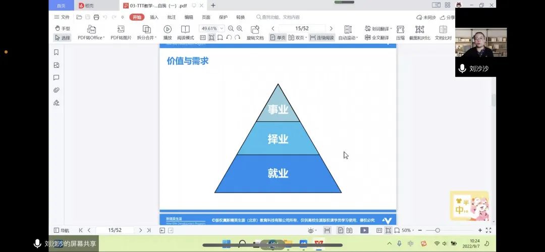 为帮助新生了解专业发展动态、强化专业归属感,树立专业学习信心,培养专业意识和思维能力,激发学习内在动力,9月7日上午10点,PP电子游戏网站学生思想政治辅导员刘沙沙老师于腾讯会议上开展了“2022级新生入学教育——新生学业规划引导教育讲座”。