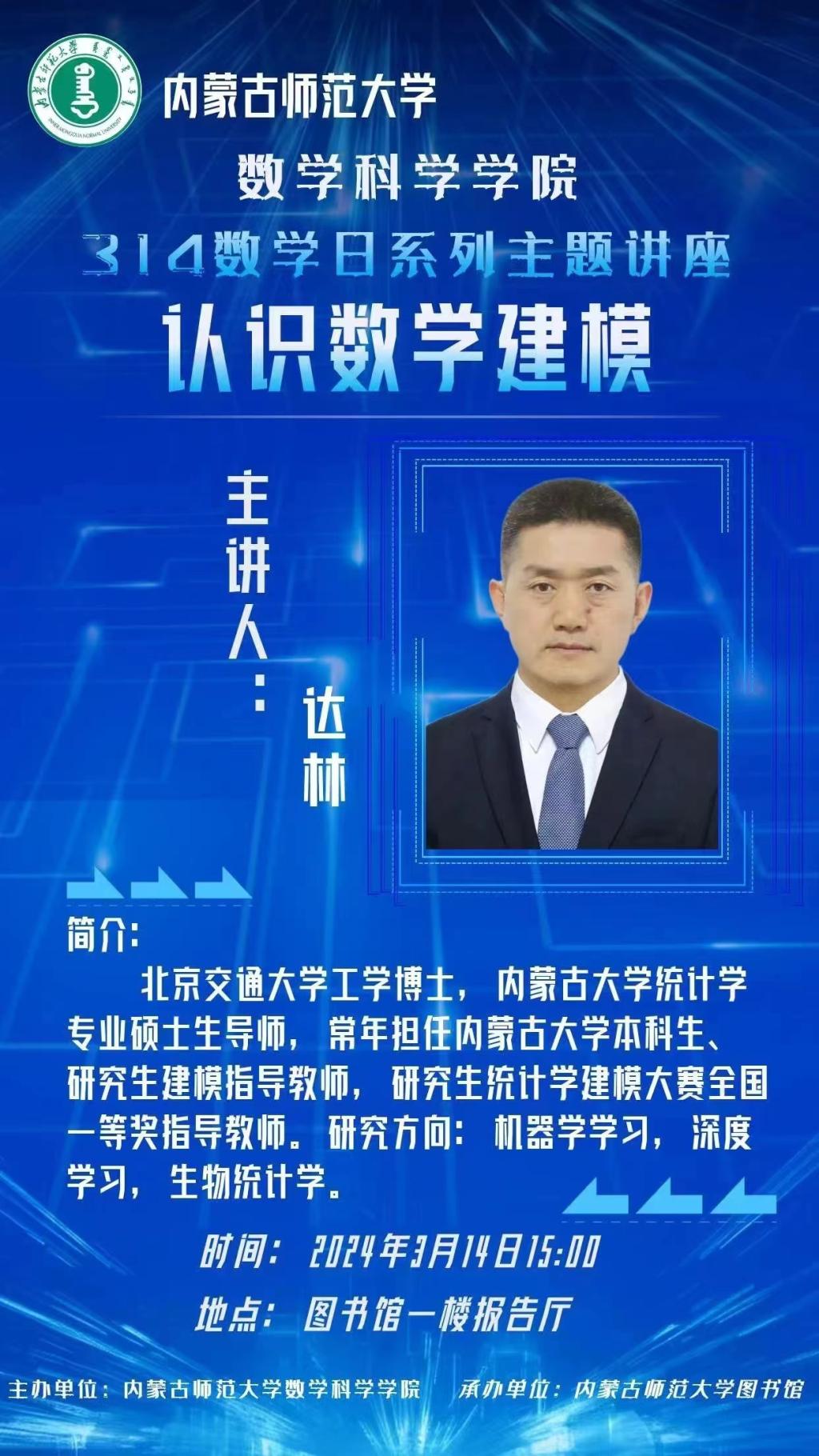 时值国际数学日,为进一步推动“一院一品”活动开展,鼓励和引导PP电子游戏官网学生踊跃参加数学建模竞赛,培养学生的创新思维和团队合作精神,激发同学们对于数学建模的学习兴趣,解答对数学建模的疑惑,3月14日下午,学院邀请内蒙古大学PP电子游戏网站达林老师进行数学建模主题讲座。