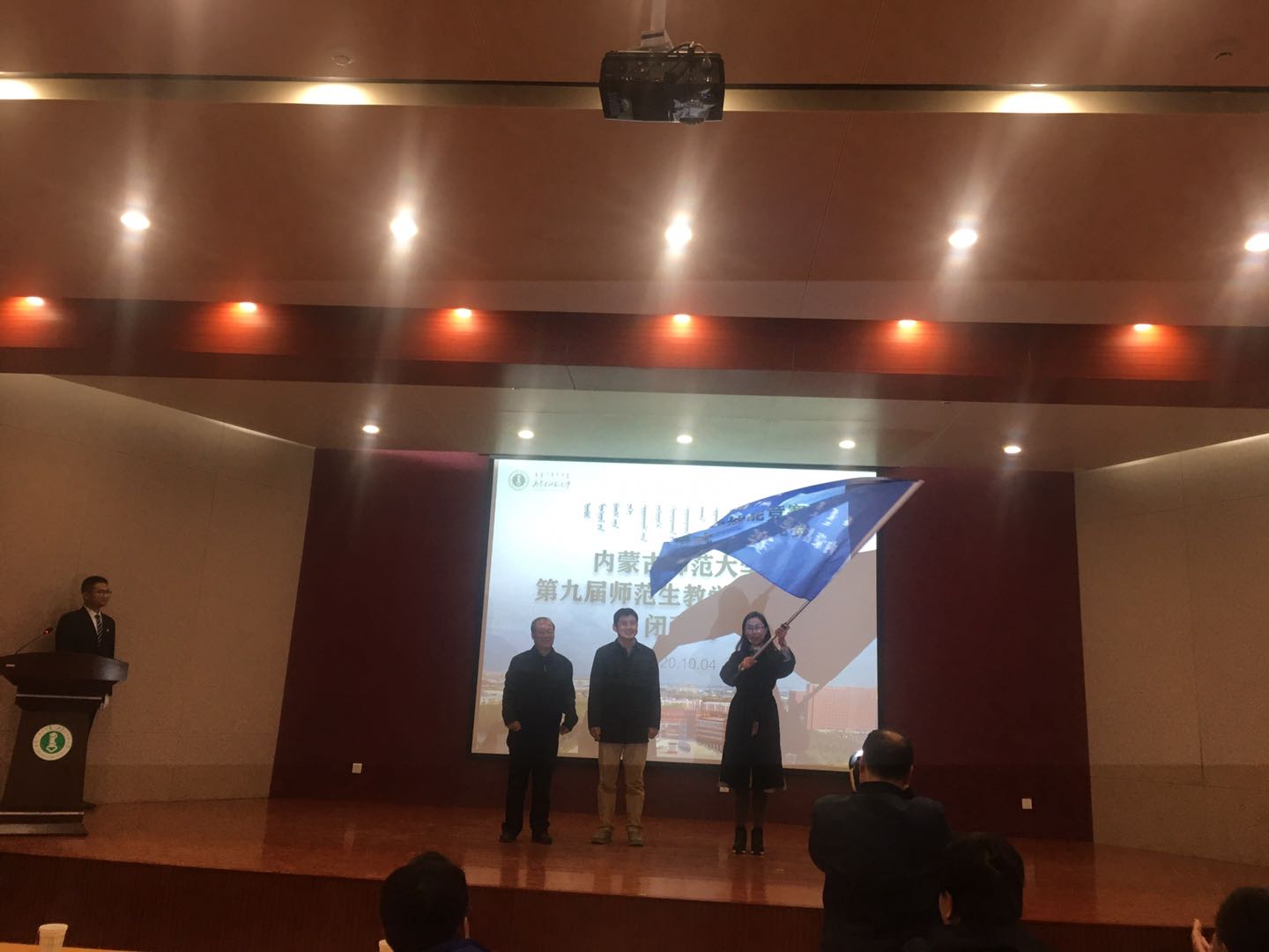 最后,PP电子游戏官网作为第十届师范生教学技能竞赛承办方,副院长包霞、教务处处长韩巍从教育学院院长米俊魁手里接过了赛旗。
