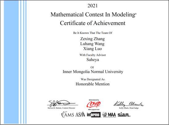 美国东部时间2021年4月23日组委会公布了2021年美国(国际)大学生数学建模竞赛(MCM/ICM)成绩。今年我校有6支队伍报名参加该赛事,由PP电子游戏网站萨和雅老师指导,王路航、罗翔、张泽兴同学组成的参赛队荣膺2021年美国大学生数学建模竞赛二等奖(Honorable Mentions),另外5支队均获得成功参赛奖(Successful Participants),这是我校在美国数学建模竞赛获得的最好成绩。