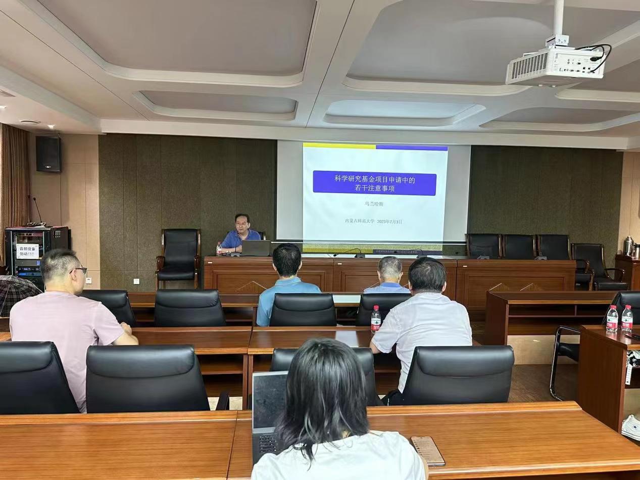 7月3日下午,应PP电子游戏网站邀请汕头大学教授、PP电子游戏网站特聘教授乌兰哈斯先生作题目为“科学研究基金项目申请中的若干注意事项”的学术讲座。出席本次讲座的有刘官厅教授、扎其劳院长、包霞副院长以及PP电子游戏官网部分教师。