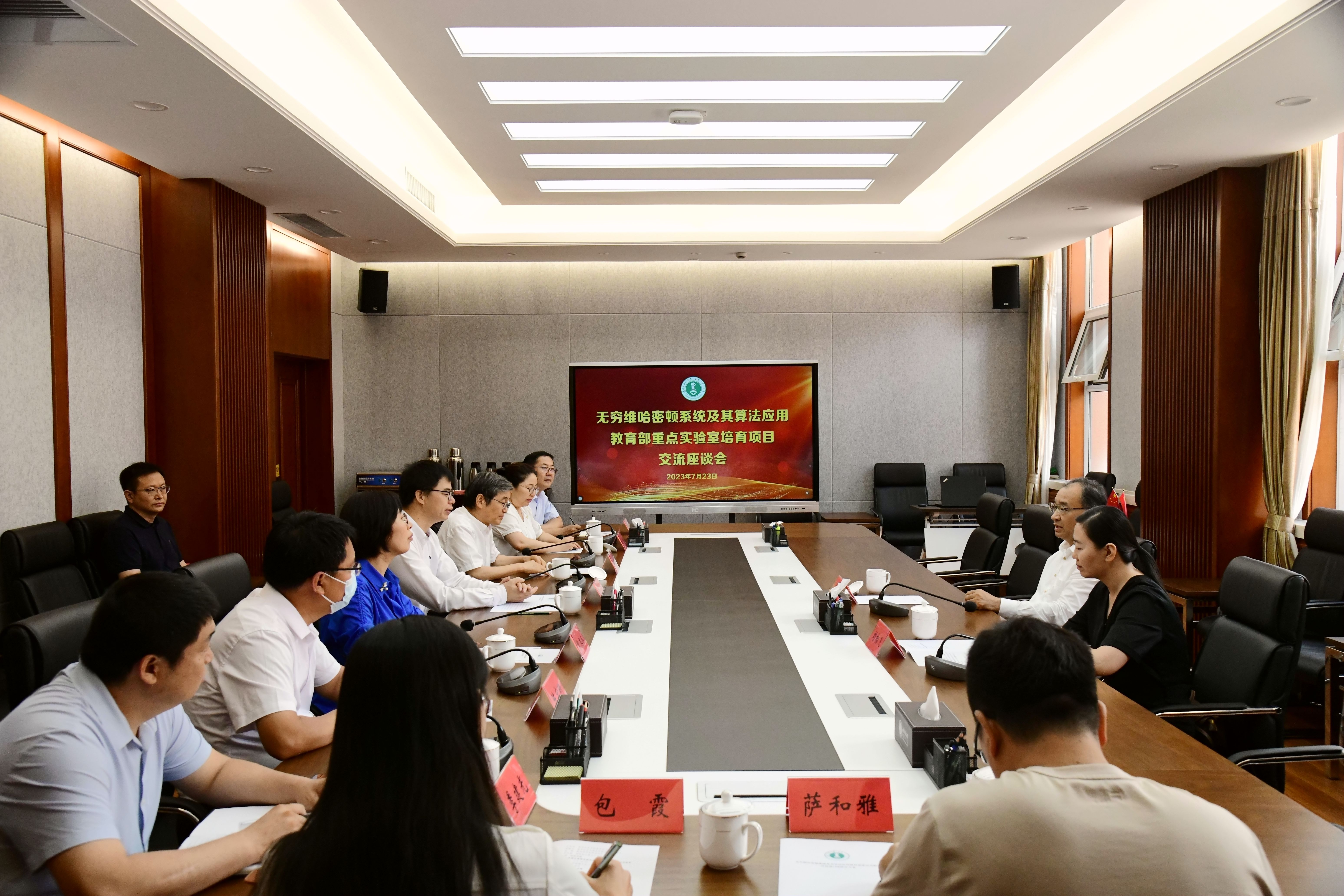 7月23日上午,教育部科技司一级巡视员高润生来我校调研无穷维哈密顿系统及其算法应用教育部重点实验室(以下简称教育部重点实验室),内蒙古自治区教育厅科学技术与信息化处处长刘相飞陪同调研。学校党委副书记校长张军、教育部重点实验室主任阿拉坦仓副校长贾美林科技处和教育部重点实验室相关人员参加了调研活动。本次调研分为座谈会和实地考察两个阶段进行。在盛乐校区行政楼206会议室召开了座谈会