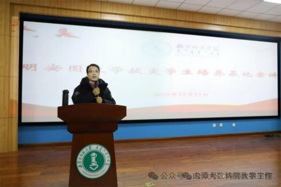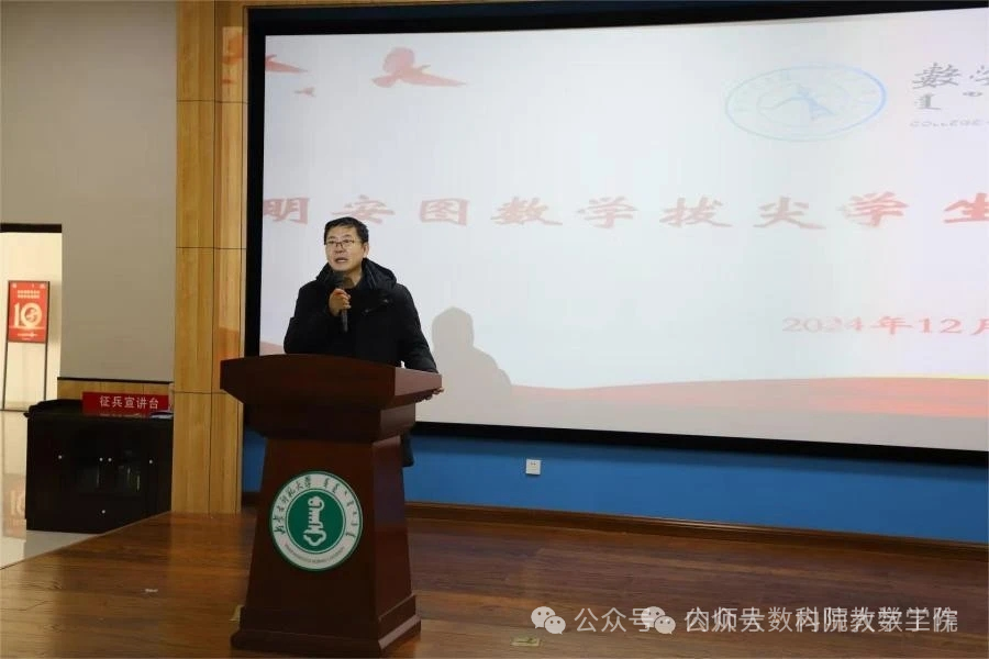12月15日,PP电子游戏网站在学生事务中心一楼107报告厅开展“明安图数学拔尖学生培养基地”(以下简称明安图数学基地)招生选拔宣讲会。学院党委书记张伟、院长扎其劳出席会议并讲话。2024级数学与应用数学(非定向)、信息与计算科学、统计学三个专业学生与班主任参加会议。会议由学院副院长萨和雅主持。