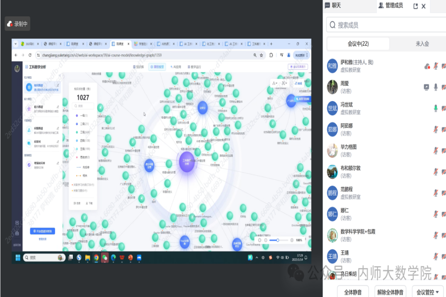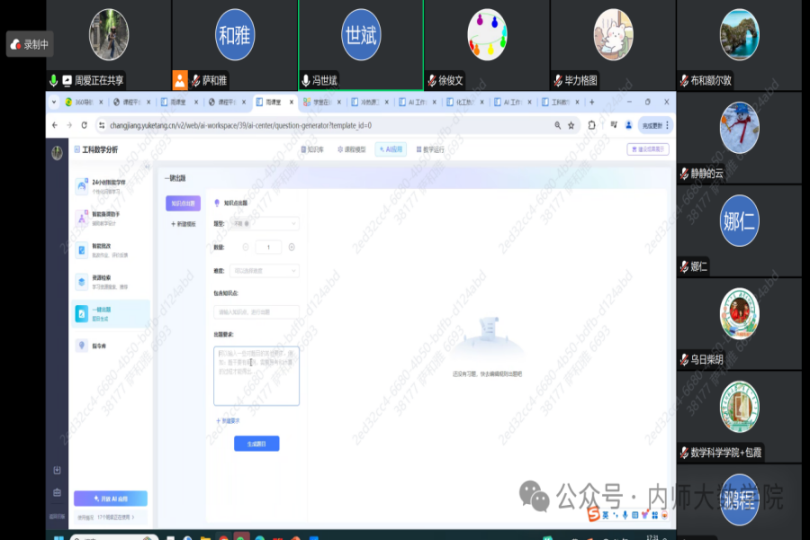 1月15日下午,PP电子游戏网站PP电子游戏网站为加强虚拟教研室的建设,丰富教研活动,特邀学堂在线的技术人员举办了一场关于AI数学课程建设的分享会。此次报告学院校级及以上一流课程团队的成员以及20余位拟建设一流课程的教师参与,会议由学院副院长萨和雅主持。