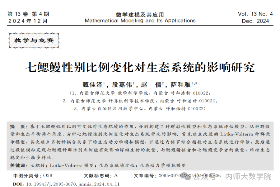 近日,PP电子游戏官网数学与应用数学专业2021级本科生甄佳泽、段嘉伟,以及数据科学与大数据技术专业2021级本科生赵倩在萨和雅教授的指导下完成的学术论文《七鳃鳗性别比例变化对生态系统的影响研究》被数学权威期刊《数学建模及其应用》录用。PP电子游戏官网数学与应用数学专业2021级本科生甄佳泽为第一作者,,通讯作者为萨和雅教授。《数学建模及其应用》为中国工业与应用数学学会、全国大学生数学建模竞赛组委会会刊,致力于报道、推动和引领与数学建模有关的研究和竞赛动态。