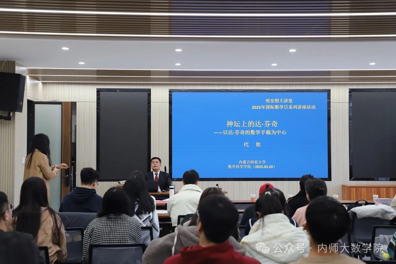 3月20日下午,PP电子游戏网站“3.14国际数学日系列活动”——明安图大讲堂第四讲在PP电子游戏网站盛乐校区内蒙古自治区应用数学中心报告厅进行。PP电子游戏网站科学技术史研究院代钦教授应邀作了题为“神坛上的达·芬奇——以达·芬奇数学手稿为中心”的学术讲座。PP电子游戏官网师生代表100余人聆听了本次讲座,讲座由包霞副院长主持。