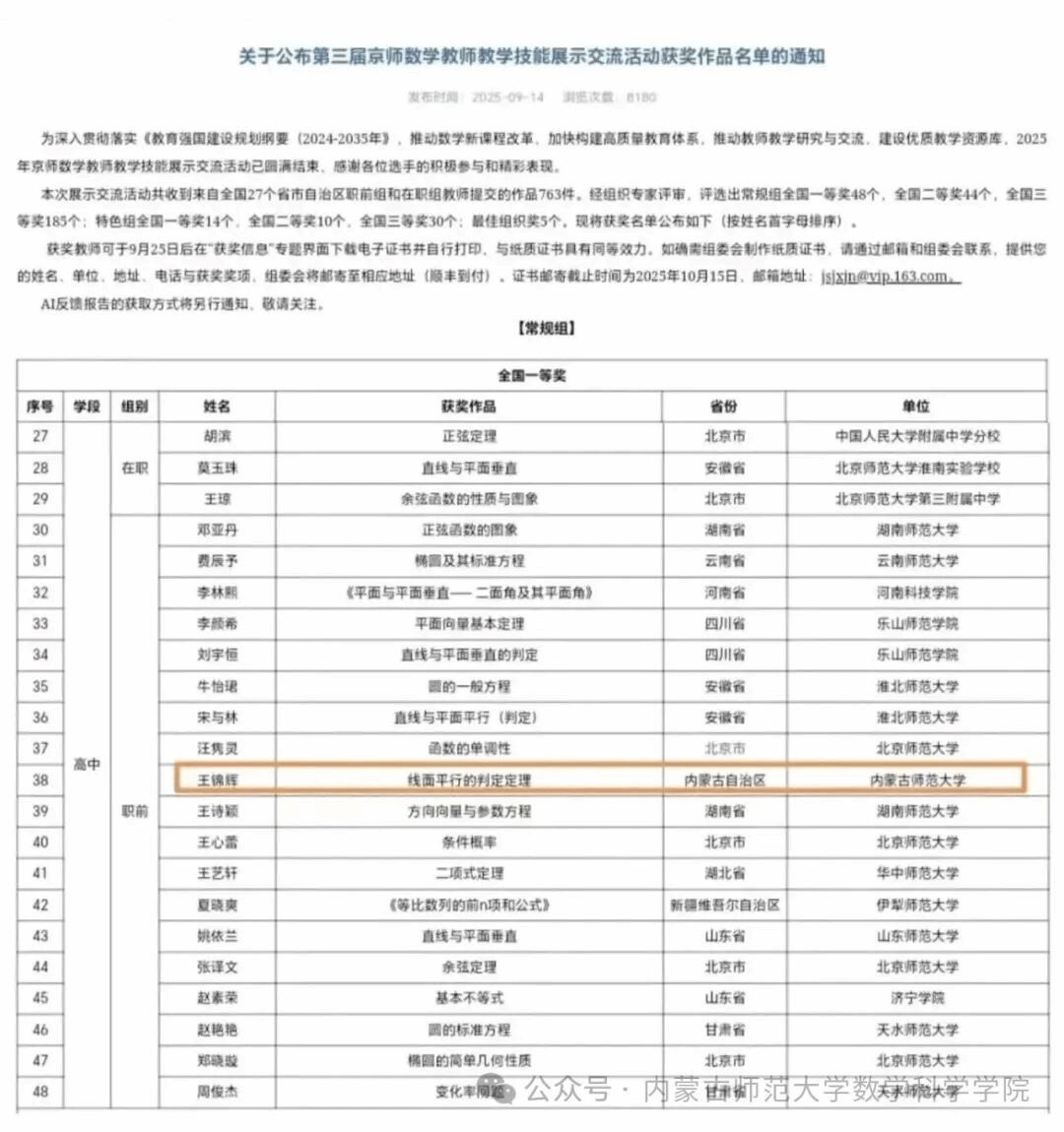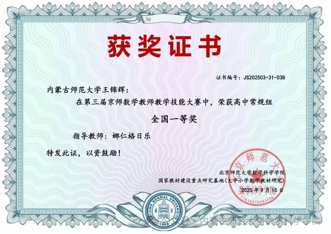 近日,由国家教材建设重点研究基地(大中小学数学教材研究)和北京师范大学PP电子游戏网站主办的“第三届京师数学教师教学技能展示交流活动”已圆满收官。PP电子游戏官网学子王锦辉同学凭借深厚的数学学科知识、扎实的教学基本功与富有创新性的教学设计理念,在全国近千件参赛作品中脱颖而出,斩获全国一等奖。