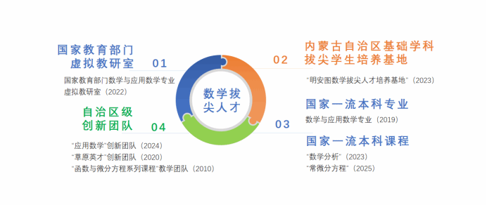 学院有“函数与微分方程系列课程”教学团队、“草原英才”创新团队和“应用数学”创新团队。数学与应用数学专业是国家首批一流本科专业建设点,专业主干课程“数学分析”“常微分方程”为国家一流本科课程,“高等代数”“解析几何”“复变函数”等均为自治区级精品课程。