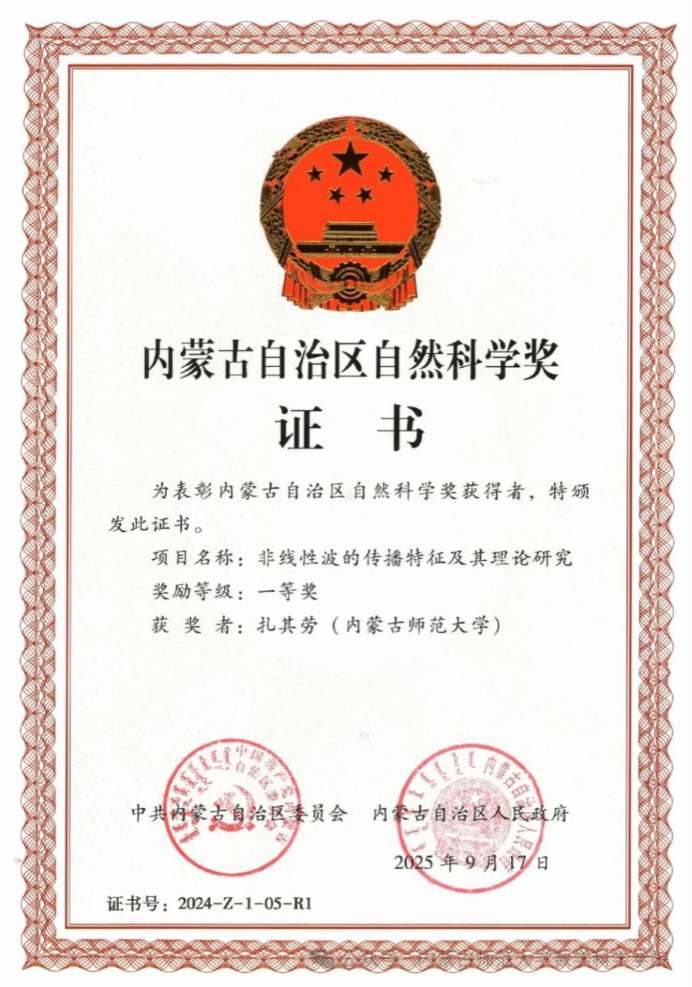近日,内蒙古自治区科学技术奖励大会在呼和浩特市隆重召开。大会表彰了为全区科技进步和高质量发展作出突出贡献的科技工作者和科研团队。PP电子游戏网站院长扎其劳教授团队牵头的《非线性波的传播特征及其理论研究》荣获2024年度自治区自然科学奖一等奖。