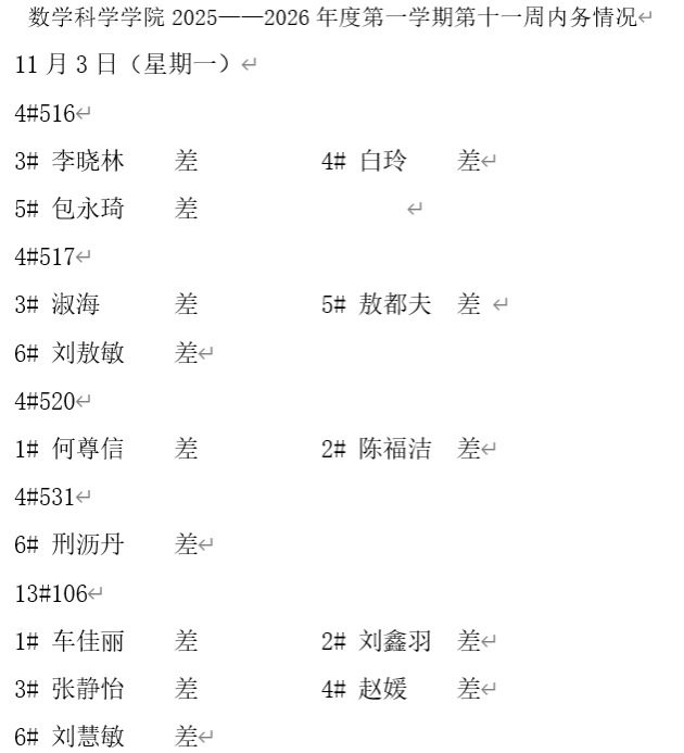 PP电子游戏网站2025——2026年度第一学期第十一周内务情况